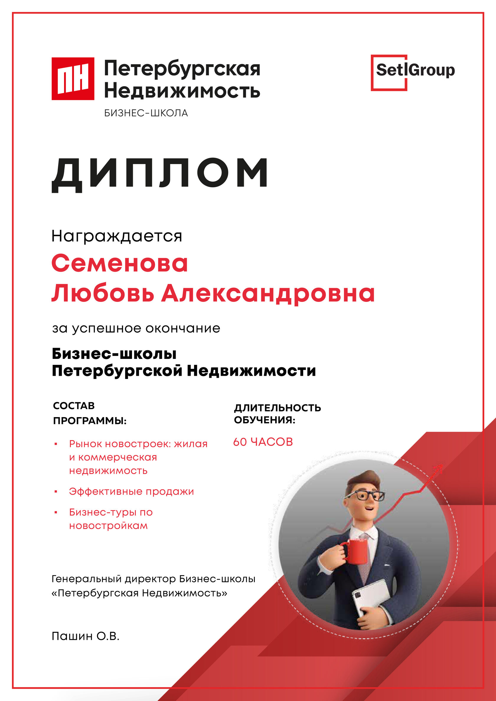 Диплом бизнес-школы «Петербургская Недвижимость»